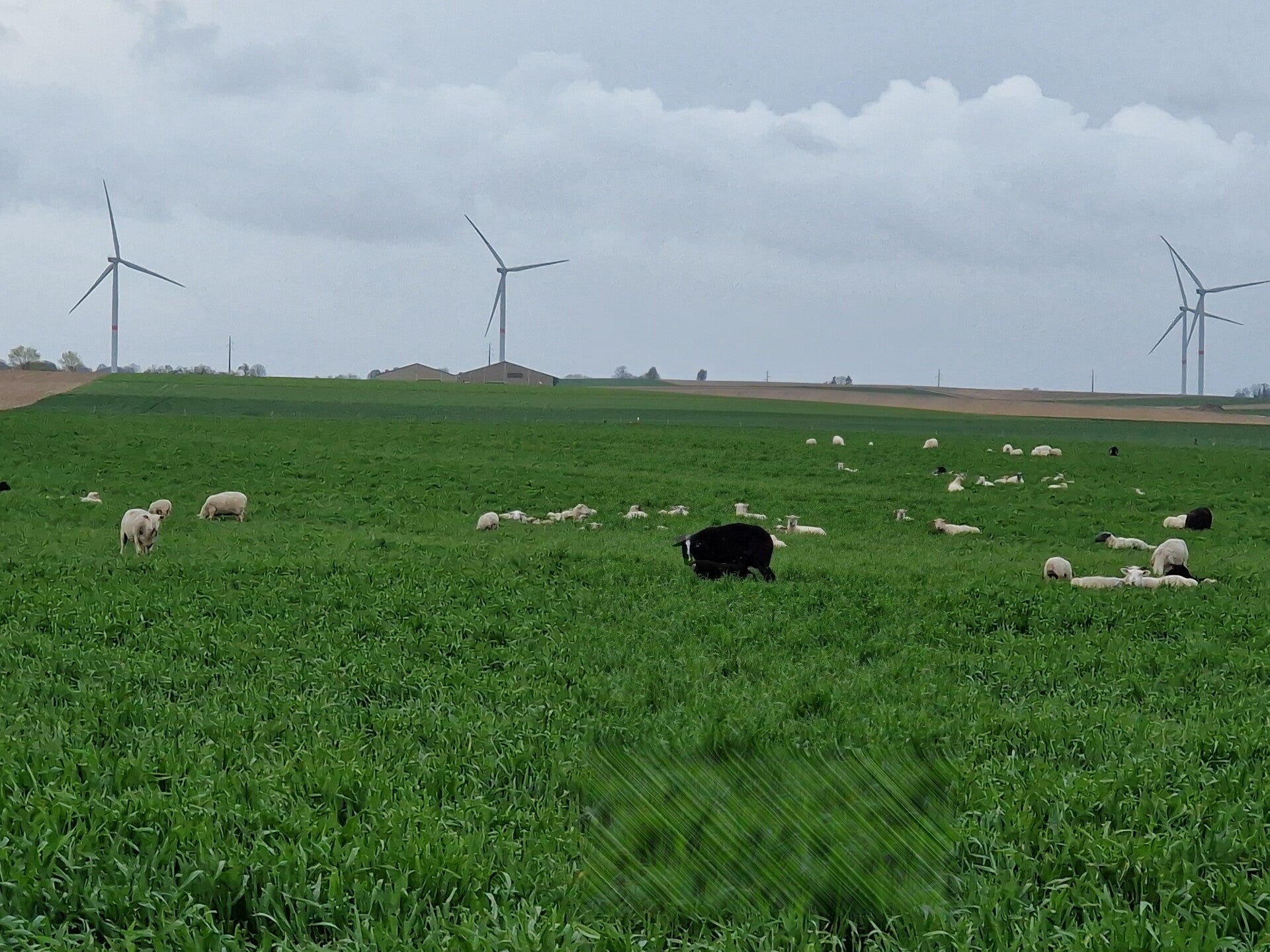 Wat verder richting Avennes terug hetzelfde open landschap van gisteren met uitgestrekte vlasgaarden, alleen andere windmolens. Ik plan om een 4 tal kilometers van de route af te wijken om in een naburig dorpje in een supra mijn boodschappen in te slaan, maar die blijkt gesloten. Ondertussen stel ik me de vraag wat ik daar in mijn regenkleding zit rond te fokken, maar mijn gedachten zijn nog niet helemaal neergedaald of de eerste plensbui is een feit. Ik keer voorlopig niet terug naar de route want enkele dorpen verder ligt er nog een winkeltje. Daar heb ik meer geluk.